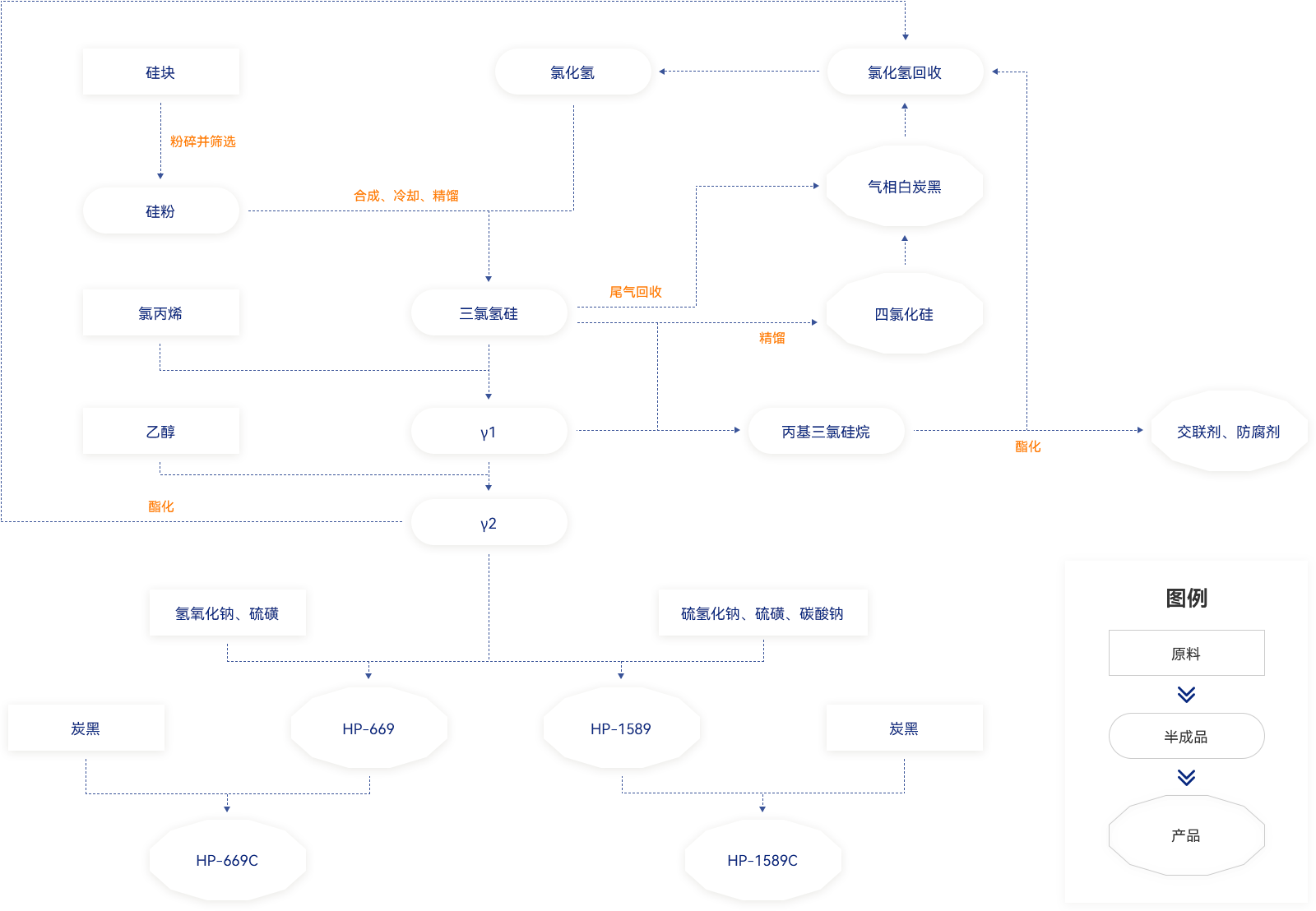 建成了“ 硅塊 - 氯硅烷 - 中間體 - 功能性硅烷 - 氣相白炭黑 ”的完整綠色循環產業鏈